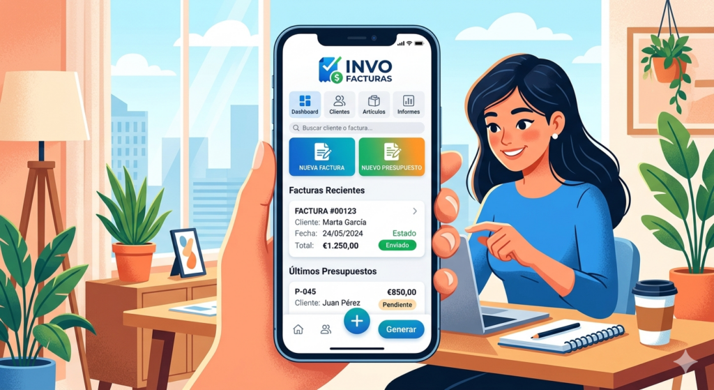 Crea facturas desde móvil o PC en segundos. -
